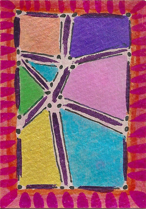 And here is each one of my 10 ATCs for November as single images. I used food color to dye a piece of water color paper, which when dry I cut into 10 ATC-sized rectangles. I decided which side of the card looked "best." Using Faber-Castell Pitt artist pens to draw cartoon border boxes on each card, I then painted in the spaces with metallic water colors. Metallic paints do not show up well on these web images, but look glittery and glitzy in real life.
