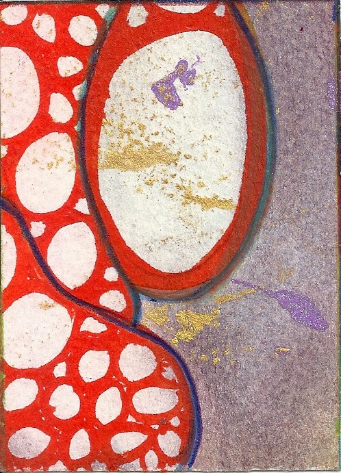 My ATC's for September 2013, cancelled due to unprecedented flooding in Lyons, Colorado, on September 11, 2013. The background was painted by Sandra (Sheronah) Leamele who gave the painting (before she moved away from Lyons ) to Loretta Milburn who gave it to me. I added the river of stones and some purple magic.